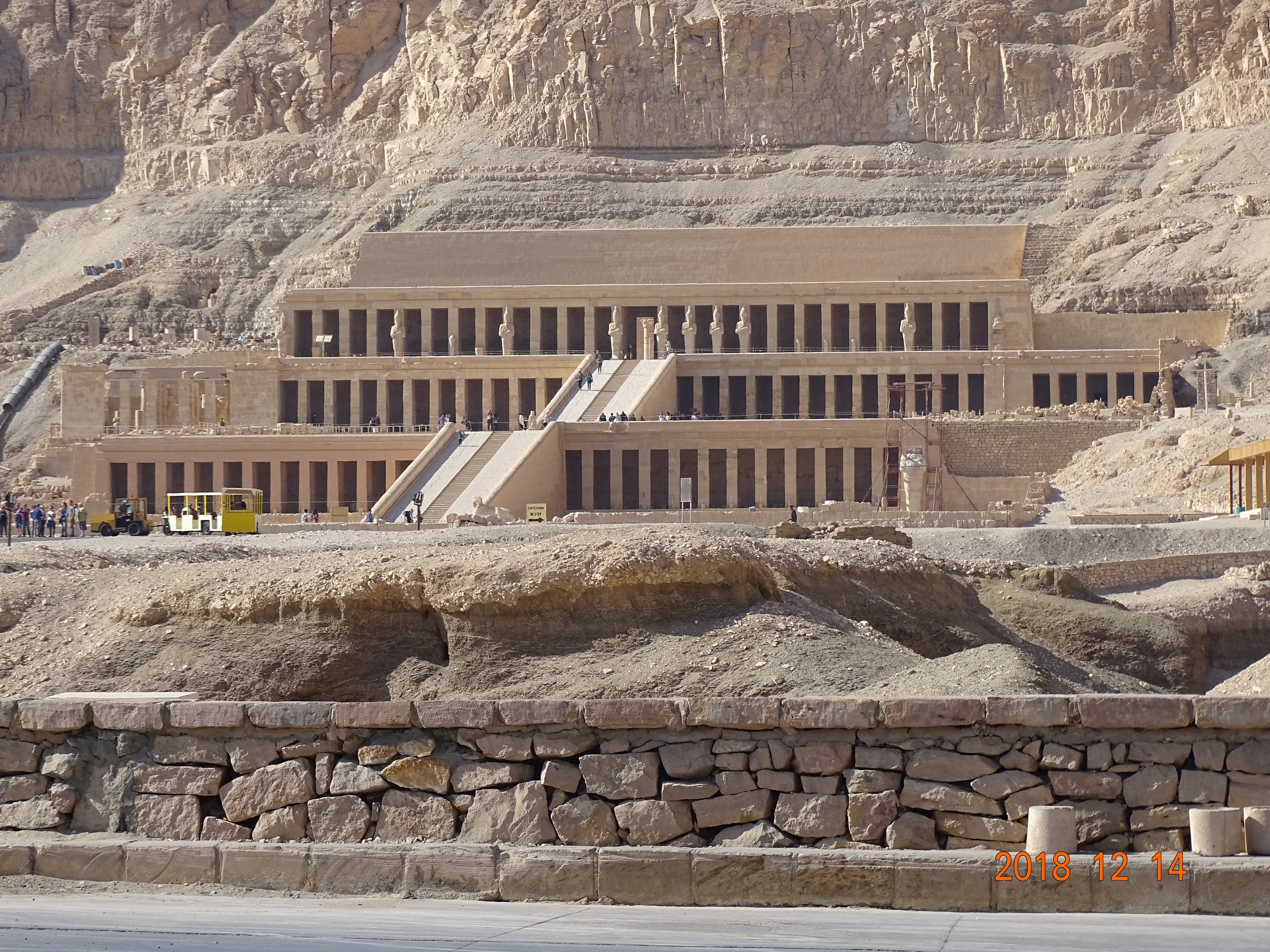 「女王靈廟」位於路克索西岸,德爾巴哈里地區。這座建築是從整座山壁中開鑿出來的神殿,分為三層,每層排列著外方內圓的廊柱,是埃及唯一的一座採用層疊形式造型的神殿建築,將神殿的縱深立體的呈現出豪壯雄偉的氣勢!當年在神殿的圍牆內,種滿了女王從索馬利亞所帶回來的香柏樹。在沒有水源的情況下,需要人力從遙遠的河邊提水回來灌溉,成片的香柏樹林當時可謂奇蹟,如今僅於一枝枯死的樹根,被一個低矮的圓形柵欄保護著,成為這一段偉業唯一的見證者。
