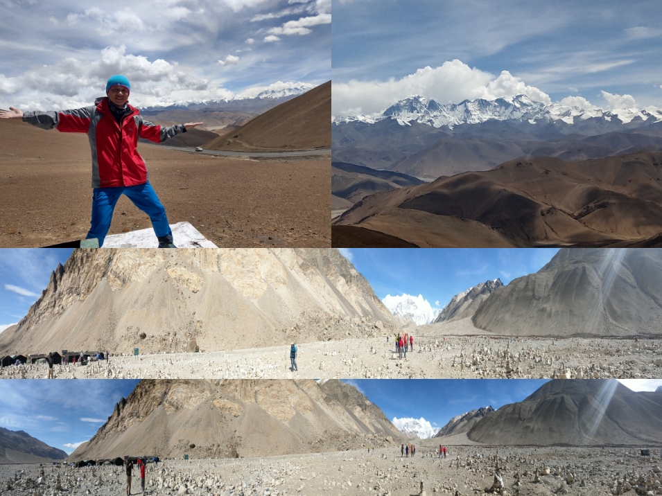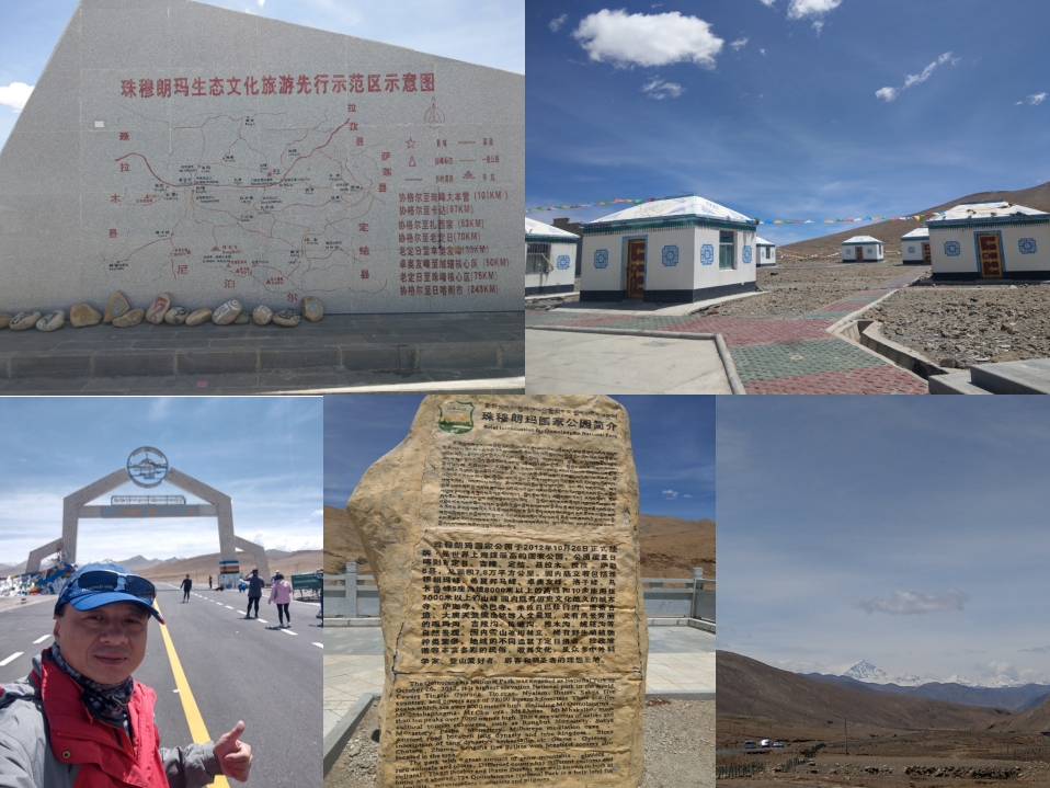 通過珠穆朗瑪國家公園牌坊(旁邊另設立珠穆朗瑪北大門石碑),一路朝大本營方向奔馳,可惜我們這次只能抵達絨布寺附近的帳蓬營區,因為薩嘎達瓦節的關係,當地政府關閉了珠峰大本營的基地營地,我們只能由帳蓬營區儘可能朝離珠峰最近的距離前進,附近有一條因珠峰溶化雪水所形成的河流,我也品嚐了河流中的雪水(因水流關係夾帶了一些石灰),順著河流一路欣賞世界第一高峰的美景,真的非常感動,一直到達最後管制點,我與水餃哥在管制點附近拍照、錄影,一直到其他團員前來找尋告知要返回,才依依不捨的離開,接著我們前往世界上海拔第一高的寺廟─絨布寺參觀,對於寺廟外大批髦牛(協助登珠峰的登山客運送物資至第一基地營)印象深刻,自己真的不敢相信已站在海拔5200公尺的地方,還要住宿在絨布寺旁的招待所。