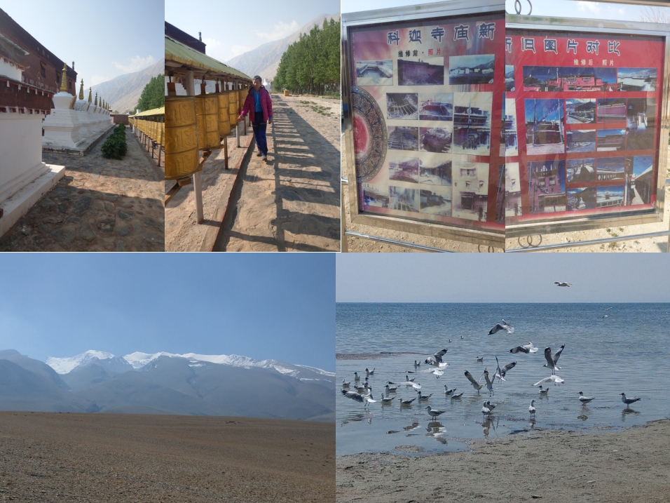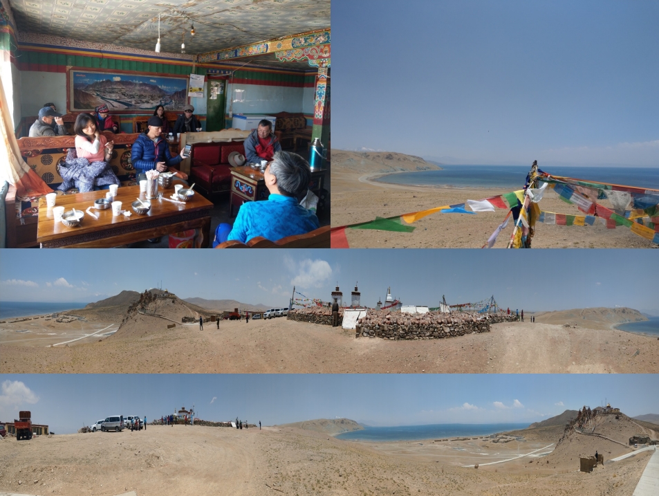 因為先有科迦寺後有托林寺,有托林寺才有阿底峽大師,有阿底峽大師才有西藏的藏傳佛教的後宏期,所以就可以瞭解科迦寺的重要性了。隨後我們搭車返回並前往拉昴措參觀,人們稱拉昴措為【鬼湖】,因為它的湖水人畜不能飲用,而且人們經常在湖面上遭遇厄運,故人們總是對它耿耿於懷,抵達時湖邊,為數聚多的海鷗在湖面上休憩,6車師傅拿了些餅乾餵食,海鷗爭相搶食的畫面,非常壯觀,午餐就在離湖邊不遠的地方享用,因地處偏僻只能以簡單的雞蛋麵及炒飯解決。期間頓堆拉還利用青稞粉加酥油茶,用手將分粉與茶水攪拌在一起,捏成團就形成糌粑,分給大家品嘗。