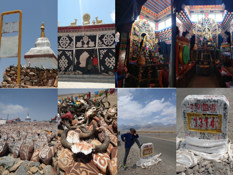 吃完午餐就前往附近參觀蓮花生大師修行洞的吉烏寺,因為不遠我與水餃哥就用步行的前往,雖說不遠也不高但走起來也不輕鬆,必竟我們都位處海拔4000以上的地方,吉烏寺視野非常棒,周遭未有阻擋,是個觀景的好地方。前往塔欽途中我們經過219國道1314的公里的石頭路樁,這在臺灣不可能會有的,1314公里好遠哦!
