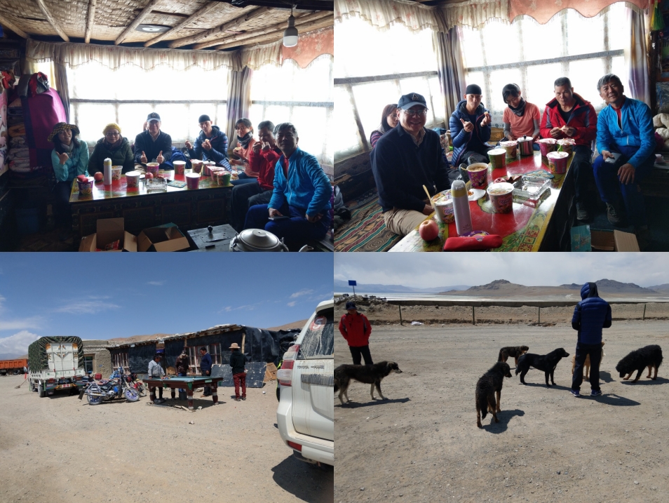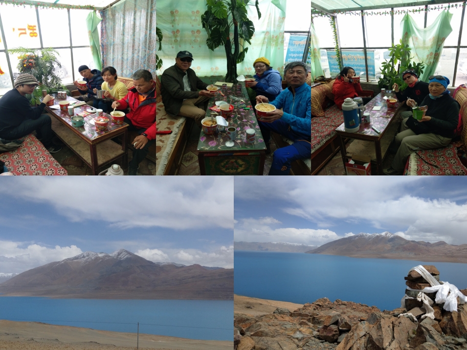 當抵達仁青休布措時,湛藍的湖泊搭配著遠處的雪山,這也是一個讓我們不想離開的地方。中午我們在湖邊的一間小雜貨店享用中餐,這個湖邊小店別看他不起眼,裡面可是生活用品、日用百貨應有盡有,中餐就泡麵及炒飯解決,炒飯還是出自頓堆拉之手,團員對於他的炒飯評價很高,真的看不出來他會下廚!