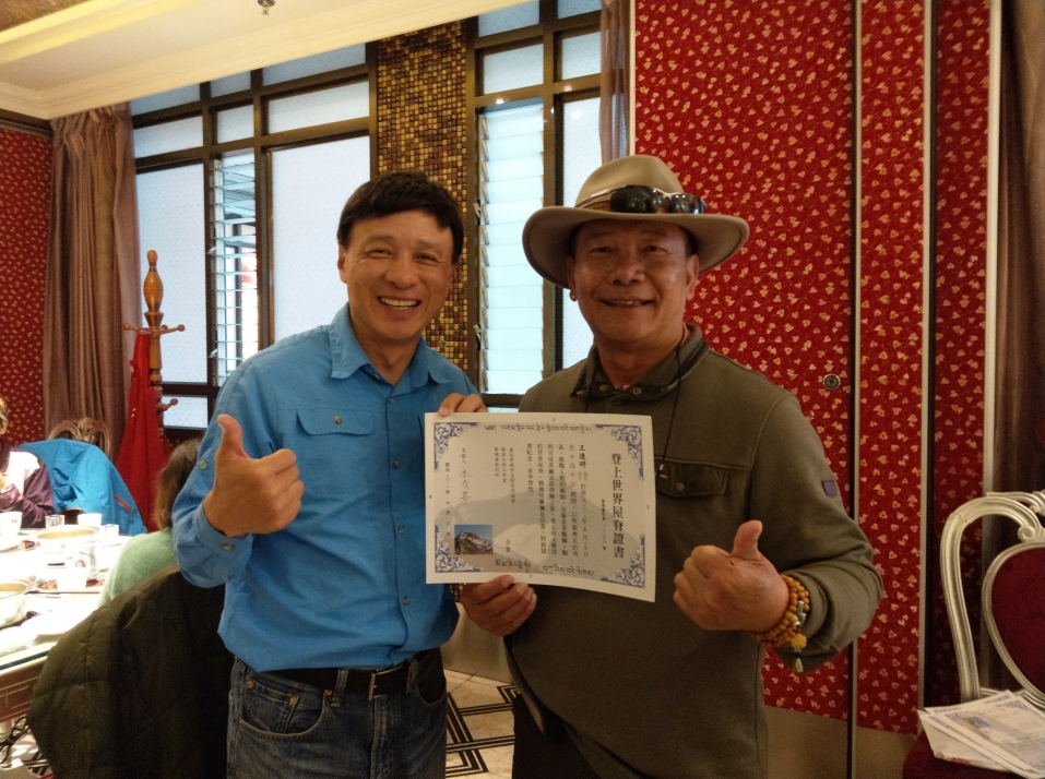 我們12人的團隊,旅行社安排了8個人來服務我們,這是我從來沒有遇過的,相信未來也不可能再遇到,整個行程順利到完全超乎想像,李大哥在最後一天搭機前說我們這團大家都是非常有福氣的人,珠穆朗瑪峰、岡仁波齊山、納木措、羊卓雍措、當惹雍措及札日南木措等,都能以最清晰優美的姿態完美的呈現,這16天的行程真的太完美,其實我從第一天晚上在布達拉宮前就非常的感動,多希望我親愛的家人及好朋友能一起來感受,西藏的文化及美景,最後還非常貼心的準備證書頒給大家,讓大家都喜出望外,能在這此行程中除了無數的照片外,能有另一個特別的紀念品,真的非常感謝。