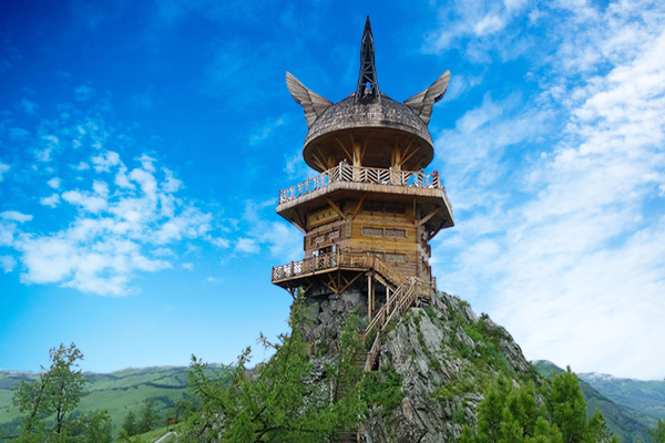 【觀魚亭】位於喀納斯湖西岸駱駝峰頂上,本為觀「湖怪」而建,因此得名「觀魚台」。與湖面的600多米的高度差讓這裡成為俯瞰喀納斯湖全景的最佳角度,不僅可將四分之三的湖面盡收眼底,還能觀覽湖周的層巒疊嶂、翠峰倒影。若舉目北望,還能清楚地看到阿爾泰山的最高峰——友誼峰。真是一步一景、如癡如醉﹗不得不發出由衷的感慨︰“不到觀魚亭,不知喀納斯湖之美”。