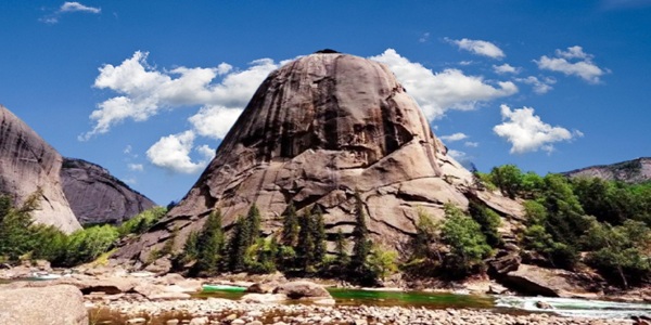 位於富蘊縣境內額爾齊斯河上游約40公里處。在額爾齊斯河兩側,坐落著兩座鐘形巨岩,高約1000米,岩石上生長著白樺樹、青松和西伯利亞雲杉,巨石上還生長著青苔,雨過天晴之際,岩峰上白雲繚繞,彩虹劃天而過,景色十分壯觀。又稱《阿米爾薩拉峰》,行至峽谷18公里,一座如鐘似錐的花崗岩奇峰在額河南岸平地拔起氣勢逼人,相對高度351米以上可謂一石一世界。