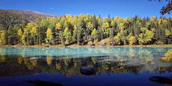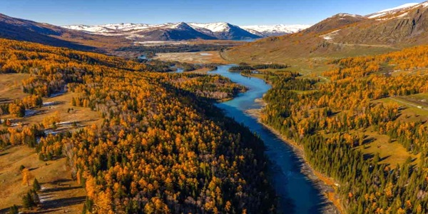 完整的巨石、逼真的神鐘山,倒扣在額爾齊斯河上,歎為觀止的時刻,山間回蕩著阿米爾和薩拉姑娘愛情的淒美傳說。每到秋季,神鐘山峽谷兩側的紅葉染紅了整個峽谷,秋意盎然,一派北國風光,猶如畫中游。