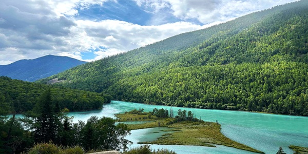 從臥龍灣沿喀納斯河北上約 1 公里,你會在峽穀中看到一藍色月牙形湖灣,那就是月亮灣。月亮灣會隨喀納斯湖水變化而變化,是鑲在喀納斯河的一顆明珠。美麗靜謐的月亮灣是喀納斯的標誌景點。從高處向下俯瞰,藍綠色的河水將一望無際,將連綿而成的白樺林一分為二,其間線條分,明煞是好看。