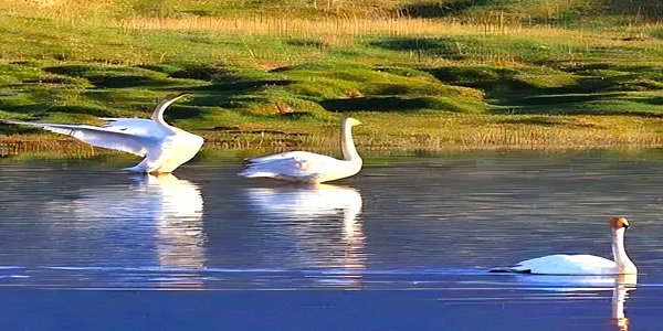 又稱野鴨湖,湖中有大小浮島 20 多個,水生植物豐富。每年夏秋季節,成千上萬的野鴨、水雞、紅雁雲集在此繁衍生息。隨後遠眺欣賞伊雷木特湖(俗稱海子口),蒙古語意為“旋渦”,是卡拉先格爾地震斷裂帶上形成的斷陷窪地,被譽為“藍色的河灣”。