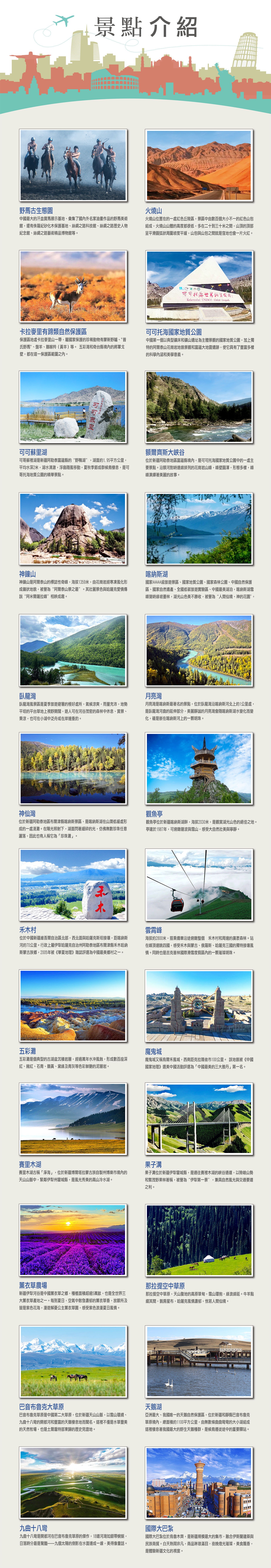 3.新疆線路長,景點分散。故乘車時間長易疲勞,請您作好吃苦準備並注意休息。在新疆旅遊時部分景點須您下車行走、爬山或騎馬,建議您最好在出發前準備一雙舒腳便於行走的鞋。