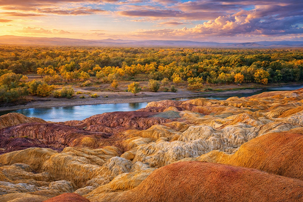 早餐後…乘車前往北疆著名的網紅沙漠公路「S21沙漠公路」。它筆直切入準噶爾盆地腹地,穿越古爾班通古特沙漠南緣,沿線景觀極具層次:一側是起伏如海浪的沙丘,一側是戈壁、胡楊林與季節性濕地,對旅人而言,S21 不僅是一條交通捷徑,更是一條現代絲路風格的風景走廊,筆直、遼闊、孤獨而壯美,開車其上,真正能體會「一線貫沙海,千里入天荒」的氣勢。接近布爾津時,這裡有中國唯一的一條注入北冰洋的河流-額爾齊斯河,河畔有一處以丹霞地貌結合河岸侵蝕作用形成的地質奇觀-[五彩灘]。這裡的岩層富含鐵、錳等礦物,經長年風化與河水切割,呈現紅、橙、黃、白、紫等多層色帶,遠望如翻湧的彩色波浪,近看則宛如一幅被時間反覆暈染的油畫。之後繼續前往布林津,晚餐後入住酒店休息。