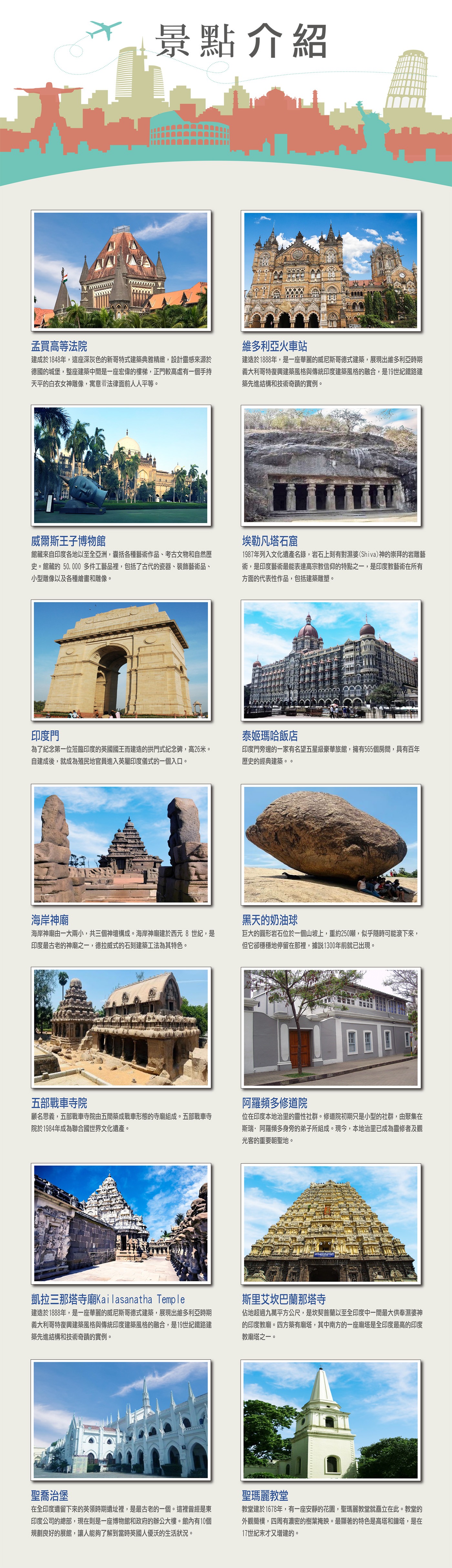 埃勒凡塔石窟:1987年列入文化遺產名錄,岩石上刻有對濕婆(Shiva)神的崇拜的岩雕藝術,是印度藝術最能表達高宗教信仰的特點之一,是印度教藝術在所有方面的代表性作品,包括建築雕塑。其中最優秀的是三面刻有濕婆神的胸像,高約5.5公尺,像岩石山一樣端正。午後返回孟買市區,參觀印度門、泰姬瑪哈飯店等景點。