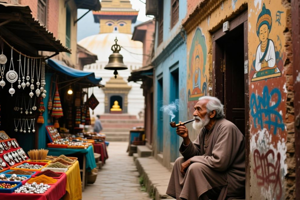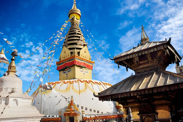 斯瓦揚布納特佛塔 (Swayambhunath Stupa) 的金色尖頂聳立在樹木繁茂的圓錐形山丘上,是加德滿都谷地所有聖地中最古老、最神秘的一座。 從山谷的四面八方都可以看到它高聳的白色圓頂和閃閃發光的金色尖頂。