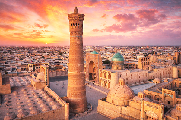 早餐後搭機前往烏爾根奇,抵達後直接前往位於烏爾根奇西南方35公里處的古城希瓦。抵達之後參觀被譽為中亞保存最完整的絲路城市之一,也是世界文化遺產「希瓦古城」,厚重的土黃色城牆將清真寺、神學院、宮殿與宣禮塔密集包圍,形成幾乎未被現代改寫的伊斯蘭城市格局。城內最醒目的地標是覆滿藍綠瓷磚的「卡塔米諾宣禮塔」,以及華麗的「帕拉凡穆罕默德陵寢」,展現帖木兒時代的建築美學與宗教藝術。狹窄街巷、陰影拱門與日落時的金色城牆,讓整座古城像一座仍在呼吸的歷史舞台。「古那亞克城堡」曾是可汗宮廷核心,能俯瞰整個古城輪廓。「禮拜五清真寺」與「石屋宮殿」構成完整的伊斯蘭城市格局,展示中亞建築的幾何美學與學術傳統。漫步伊瓊卡拉,彷彿走入帖木兒時代的時間層,絲路文明仍在城牆內回響。