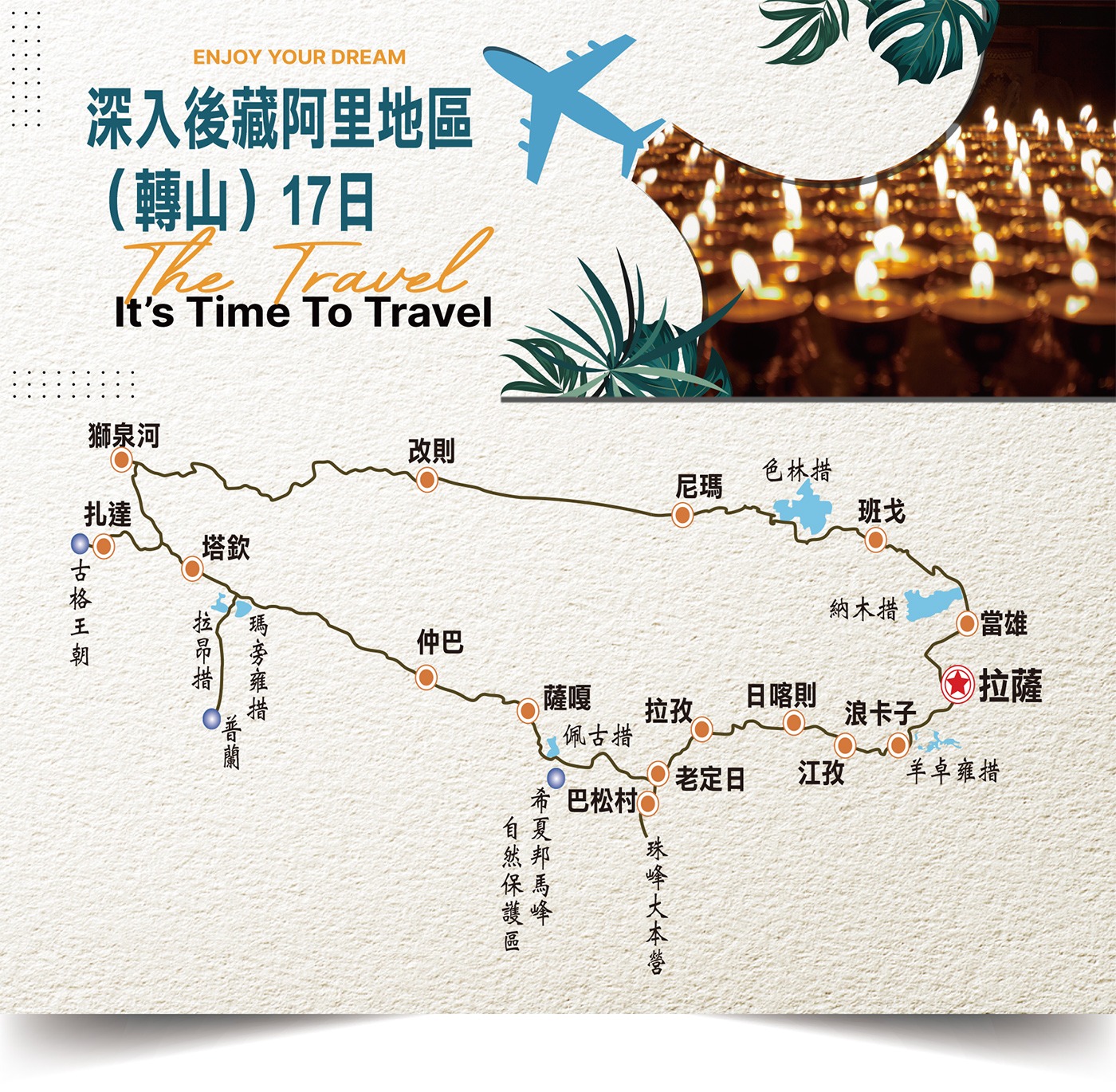 深入阿里腹地,探訪雄偉的古格王朝遺址。在土林環繞的高原之上,見證千年前消失的文明奇蹟;並走訪規模宏大的皮央石窟,領略藏傳佛教後弘期珍貴的藝術遺存。
