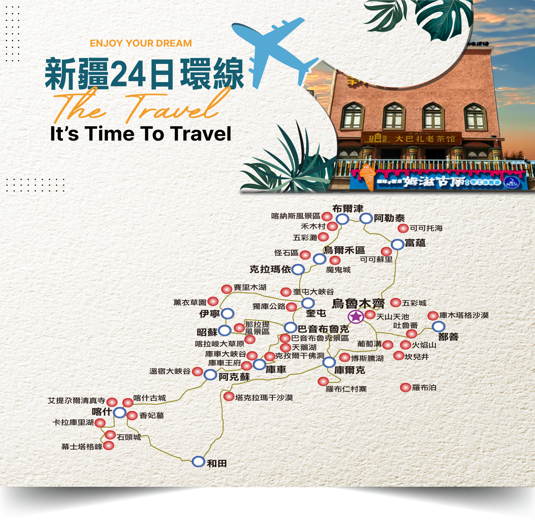 這是一條極致的環線,一次涵蓋北疆的純淨森林、中疆的空中草原以及南疆的絲路人文與高原風光。24天的深度規劃,完整勾勒出新疆多元且宏大的地理輪廓。