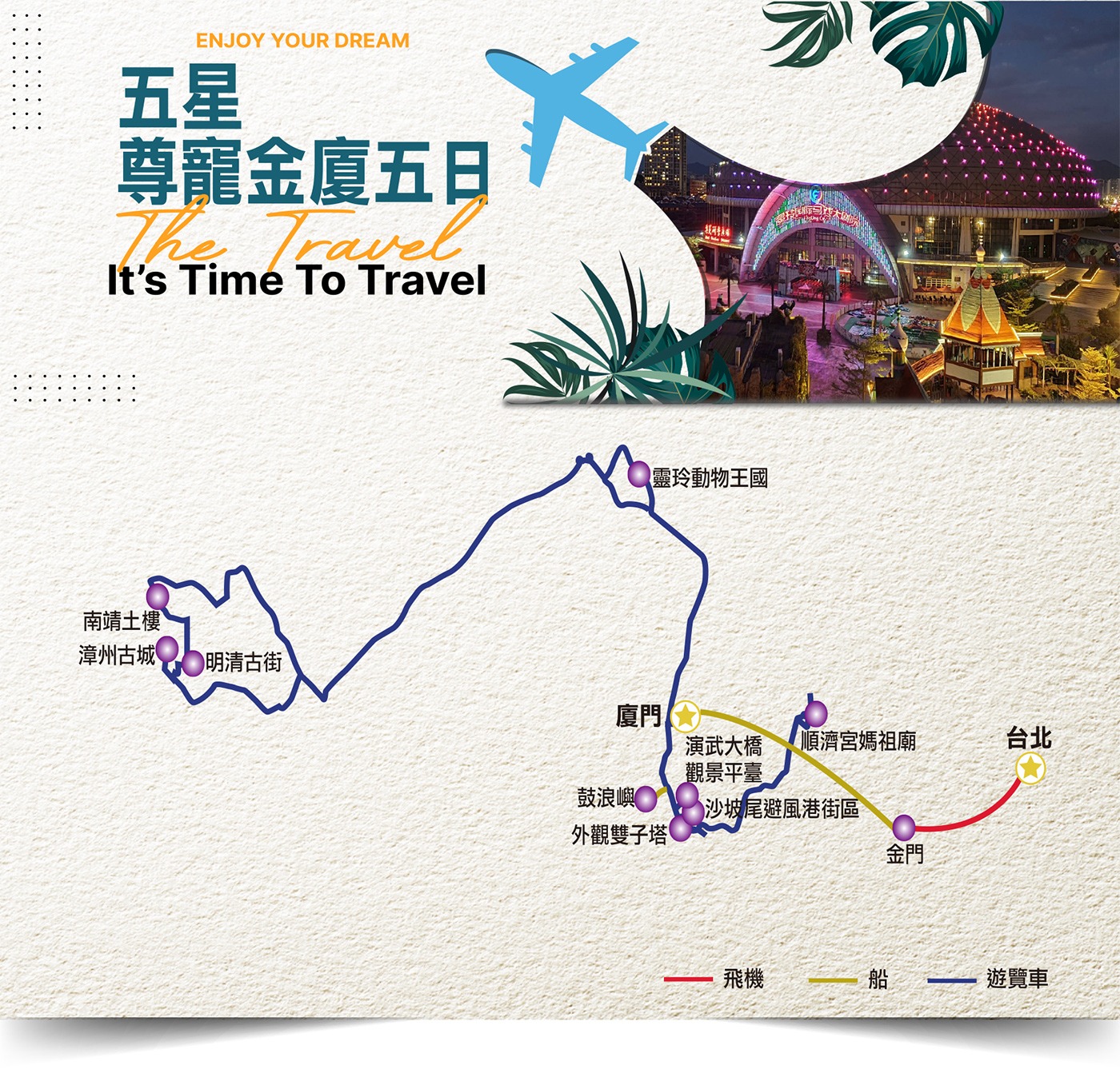 交通安排體現「尊寵」二字:利用金廈小三通快輪跨越海峽,僅需約 30 分鐘即可往返兩岸,免去長途飛行疲勞。在兩地皆使用大空間豪華旅遊巴士接駁,並確保住宿於五星級品牌酒店,讓旅程移動與休息皆是享受。