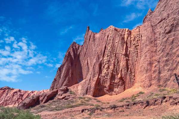 位於314國道的咽喉部位,蓋孜大峽谷裸露隆起巨大山體,層層疊疊,褶皺縱橫。山尖如削、赤紅如焰的蓋孜峽谷從山崖的橫斷面,可以清晰的看出不同岩質。