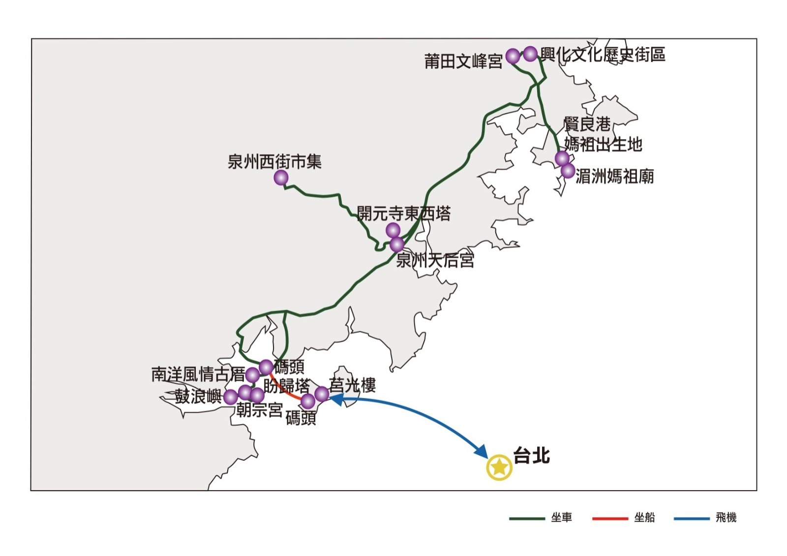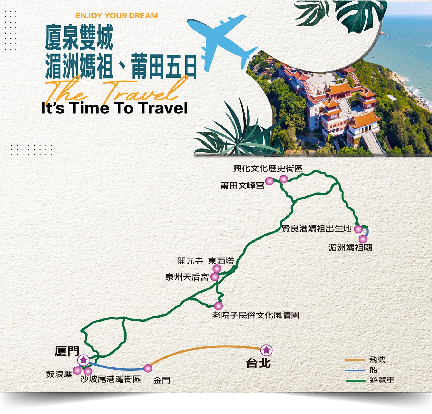 為了維持旅程的高品質與舒適度,行程在交通上規劃完善:包含往返湄洲島的專屬快輪接駁,避免候船勞累;市區與城市間移動則使用豪華大型空調旅遊巴士。