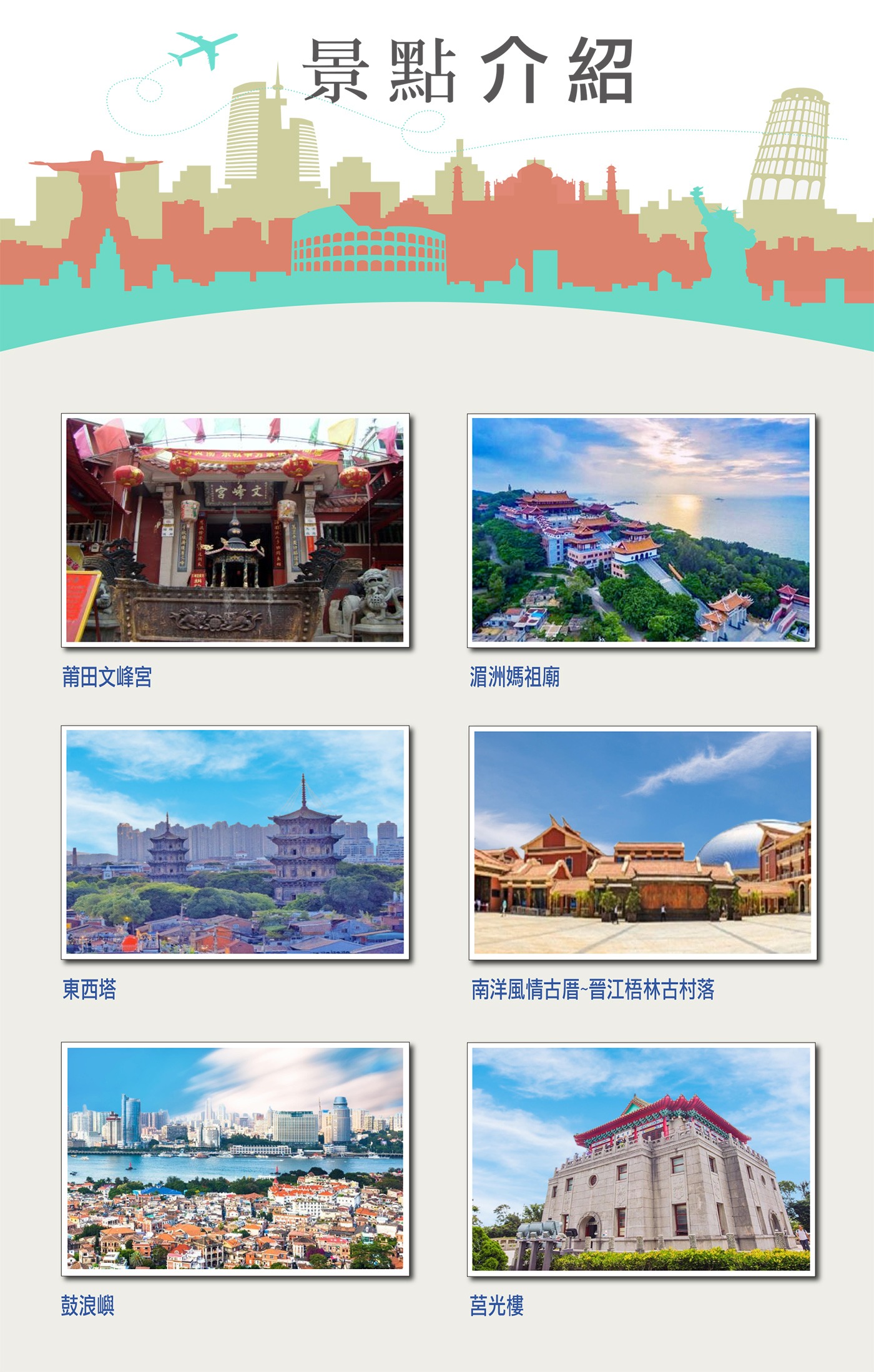 【湄洲媽祖廟(含渡輪、島上電瓶車) 】 傳說湄洲島是媽祖林默娘的家鄉,湄洲媽祖廟位於湄洲島的北端。初建於宋代雍熙四年,西元 987 年,是爲紀念媽祖而設立的,也是她羽化升天的地方,是世界上最早的媽祖廟。在文化大革命期間,媽祖廟幾乎全毀。 1980 年代以來,海內外信徒捐資對湄洲祖廟進行重修,廟宇現有建築基本上都是文革後重建的,也因為信徒的支持捐贈,現在已經形成 錯落有致、輝煌壯麗的建築群,有海上香格里拉的美稱。祖廟內由牌坊、長廊、山門、香爐台、儀門、廣場、鐘鼓樓、正殿、寢殿、梳妝樓、朝天閣、升天樓、媽祖石像、佛殿、觀音殿、五帝廟、中軍殿、聖父母祠等大大小小的宮殿所組成,殿裡的神像都非常巨大雄偉,像是千里眼跟順風耳是媽祖的守護使者,馬將軍則是為媽祖的傳達訊息的快遞。而在太子殿裡面有二尊媽祖,其中一尊是分靈給台灣的媽祖,每隔一年到三年,分靈出去的媽祖會回一次娘家,在媽祖祖廟裡還有一個特點,就是沒有「門檻」,表示不分男女老幼都可以來參拜,也是唯一不忌諱照相的廟宇。