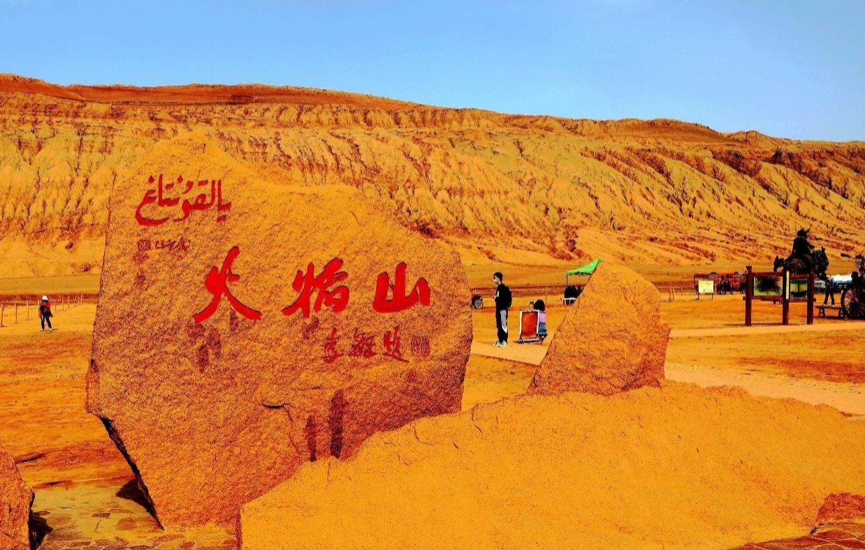 火焰山橫臥吐魯番盆地,赤紅山體如烈焰燃燒酷熱難耐,傳說孫悟空借芭蕉扇滅火。山腳綠洲葡萄園生機盎然,形成“火焰與綠洲”的奇景。