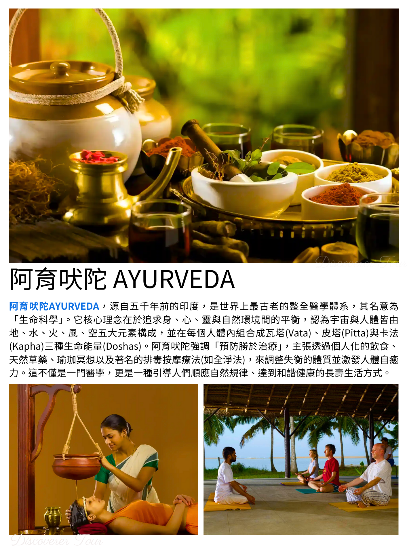 阿育吠陀:古老修復系統的療法,已有5000年實踐歷史。梵文阿育吠陀是源自“Ayus”和“Veda”,分別代表生命和知識。因此阿育吠陀一詞的意思為生命的科學。它不僅是一門醫學體系,而且代表著一種健康的生活方式。在本質上,阿育吠陀的目標是治療身體、心智和靈魂,與經過專業訓練的按摩師和理療師與私人教練、營養師和阿育吠陀醫生共同合作,一起為您創造生命和諧的幸福感。