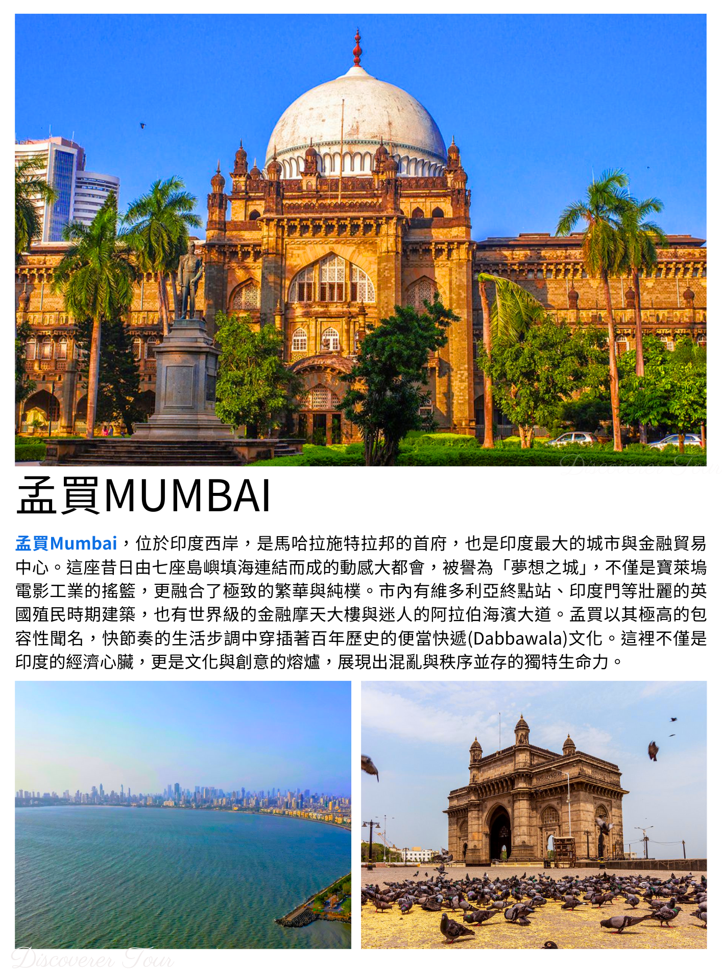 今天將搭機飛往孟買Mumbai,是印度的金融、商業與娛樂中心,也是世界知名的「寶萊塢」電影工業大本營。這座座落於西海岸的港口城市,以其強烈的對比著稱:宏偉的維多利亞式殖民建築與現代摩天大樓交錯,展現出高度的包容力與活力。作為「印度的門戶」,孟買不僅擁有繁忙的證券交易所,更以迷人的馬林大道海景與永不眠息的都市節奏,吸引著無數追夢者,是印度最具國際化色彩與經濟影響力的超級都市。