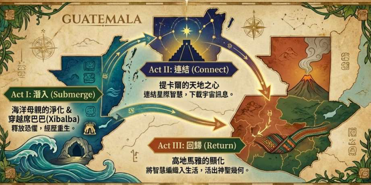第三幕:回歸世間之心一最後我們抵達瓜地馬拉高地,高地馬雅人保存了完好的古馬雅智慧,在生活裡日日實踐,是現今紛亂世道裡最珍貴的顯化心法。